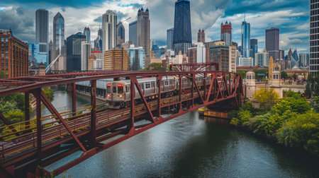 A commuter train crossing a steel truss bridge, transporting passengers across a bustling city river