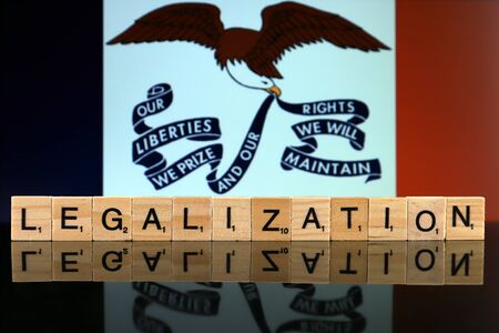 WROCLAW, POLAND - FEBRUARY 04, 2020: Iowa State Flag and word LEGALIZATION made of small wooden letters. Drug policy. Legalization of marijuana.