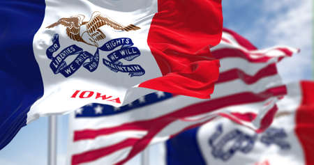 The Iowa state flag waving along with the national flag of the United States of America. In the background there is a clear sky. Iowa is a state in the Midwestern region of the United States