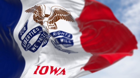 Close-up of the Iowa state flag waving. Three vertical stripes of blue, white, and red, with a bald eagle in the center. 3d illustration render. Textured fabric background. Selective focus