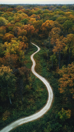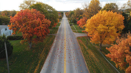 A scenic aerial view of a tree-lined road with falling leaves visible from above