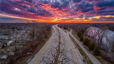 An overhead shot showcases a highway splitting through a forest under a striking sunset. The road's surface is damaged, marked by prominent cracks. The sky presents a vibrant gradient of colors. This image would be suitable for editorial content or commercial projects focused on environmental themes.