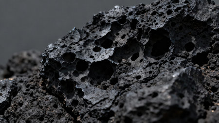 Extreme macro shot emphasizing the sharp, jagged texture of black igneous lava rock against a smooth, dark gray blurred background, highlighting deep cavities.