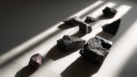 Scattered dark volcanic rock fragments on a light gray surface with high contrast lighting and shadow play
