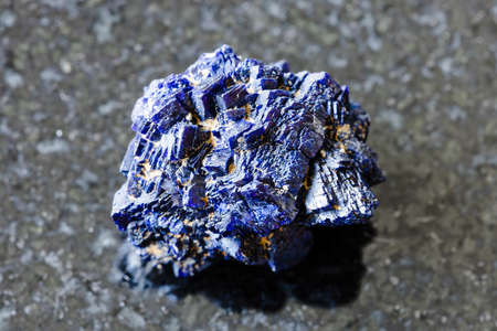 macro photography of sample of natural mineral from geological collection - unpolished Azurite mineral crystals from Jezkazgan, Kazakhstan on black granite background