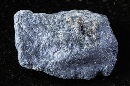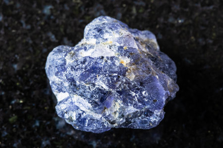 sample of raw iolite mineral on black granite background close up