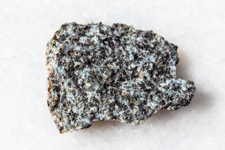 sample of raw gabbro-norite mineral on white marble background close up from Karelia, Russia
