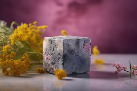 An AI generated illustration of a grey concrete block surrounded by vibrant flowers