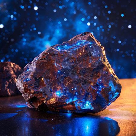 Glowing crystal rock on a reflective surface