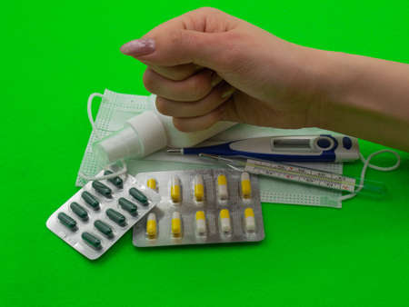 tablets and a thermometer on the table. protection from the virus