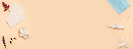 Banner. seasonal allergy. spring bloom allergy. Nasal spray medical mask flower and pills. Flat lay on beige background. vertical. copyspace. Place for text