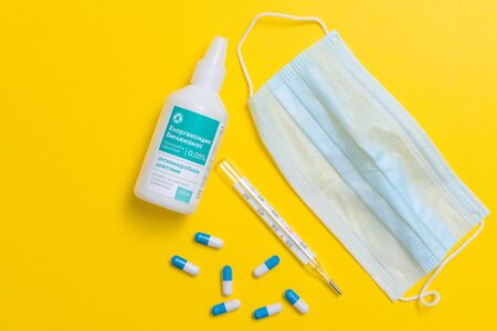 Blue pills, thermometer, antiseptic, face mask, yellow background. Top view