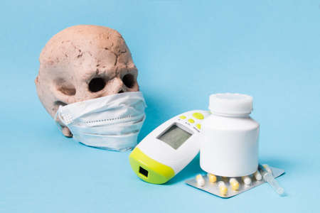 pills, drugs, syringe, infrared non-contact thermometer and ceramic skull in a protective medical face mask on a blue background, copy space, high temperature concept