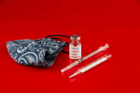 Medical tools and face mask on red