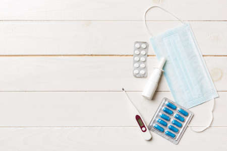 Protective face masks or surgical masks, medicine pills and thermometer on table background. coronavirus disease. Corona virus concept. Space for text.