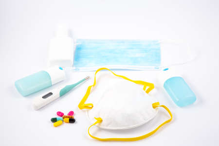 Mask for wearing germ protection Coronavirus or covid19 and gel alcohol or hand sanitizer bottle for washing hand, fever monitor for doctor and hospitals in isolated on yellow background.