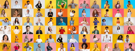 Collage of portraits of an ethnically diverse people demonstrating different emotions isolated over multicolored backgrounds.