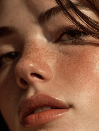 This image features a close-up view of a beautifully freckled face, highlighting the soft lips and natural skin glow. It captures the essence of youth and authenticity.