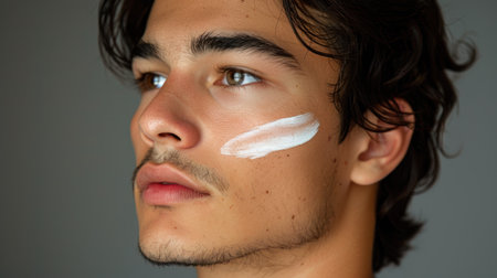 Portrait of young metrosexual man applying cream on his face and looking at camera