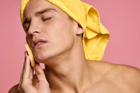 man with a towel on his head and a yellow sponge in his hand cosmetic procedure clean skin of the face