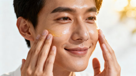 Close up portrait of a smiling East Asian male massaging highly reflective, amber facial gel onto his cheek under warm, bright, sunlit conditions featuring golden bokeh background.