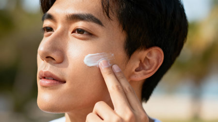 Profile of a young adult Asian male model gently rubbing a thick white protective lotion onto his cheek, highlighting skin health under strong natural daylight outdoors.