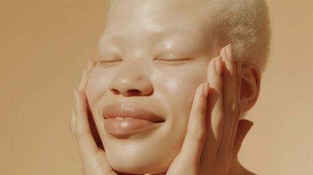 This close-up portrait captures African albino girl peaceful expression with hands gently cradling their smooth, bald head, set against a neutral beige background.