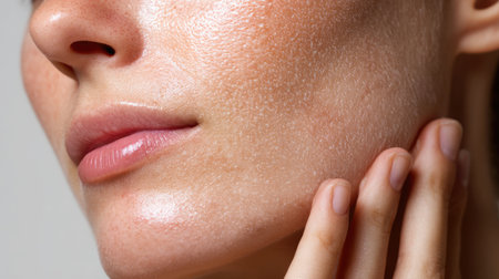 A detailed close-up image of a woman's face showcasing smooth, glowing skin. The natural beauty is highlighted by a gentle touch of her hand on the cheek, emphasizing skin texture.