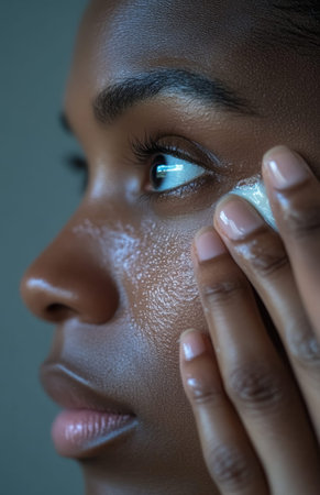 African American woman gently applying skincare cream, with soft lighting highlighting her smooth, radiant complexion