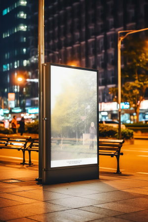 Nighttime Illumination Glowing Billboard, City Center, Empty Advertising, Street Marketing.