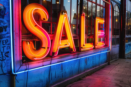 Capture the thrill of commerce with this vibrant neon SALE sign, illuminating nighttime streets and beckoning shoppers to amazing deals.