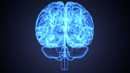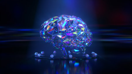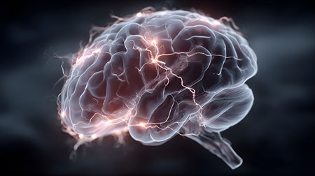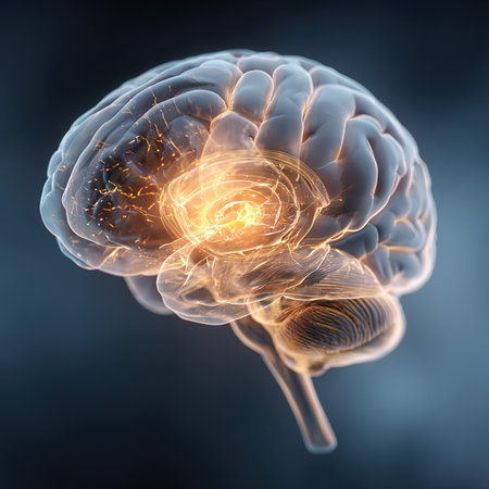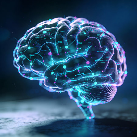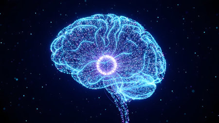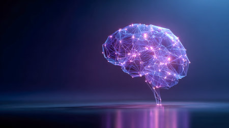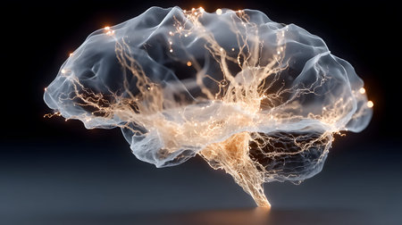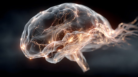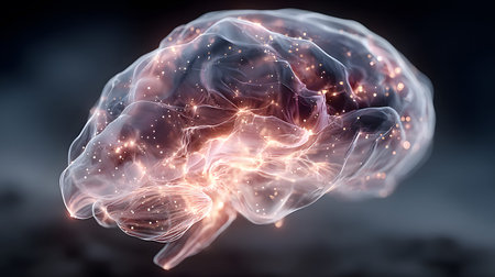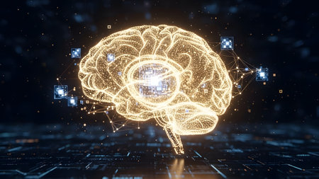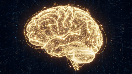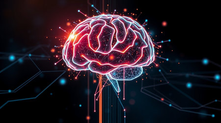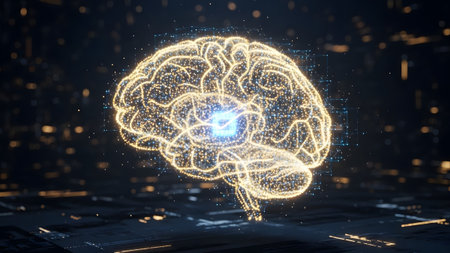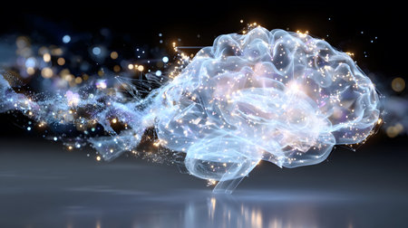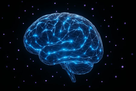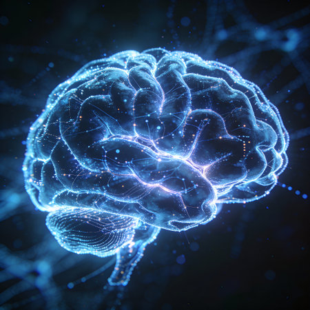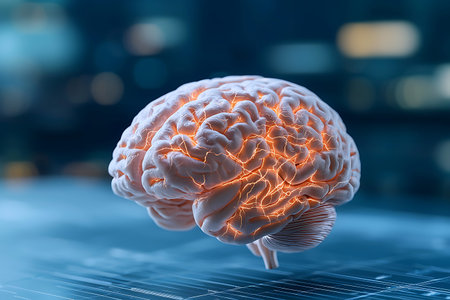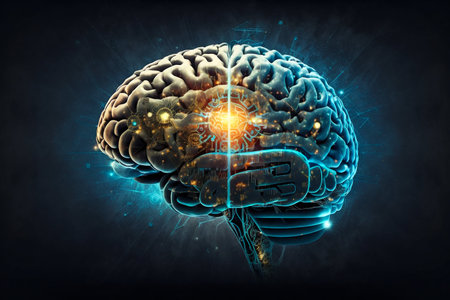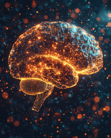 A detailed 3D rendering of a human brain featuring glowing elements, set against a dark background. Ideal for themes of science, technology, and neuroscience.