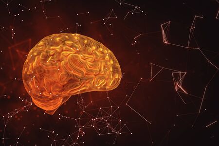 Computer generated artificial intelligence. 3d rendering of the shape of the human brain from a wireframe against the background of colored lights