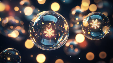 Close-up of glowing snowflakes inside transparent Christmas ornaments with golden bokeh lights, creating a festive and magical atmosphere.