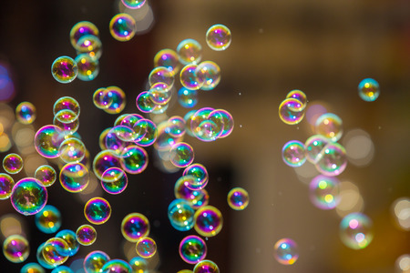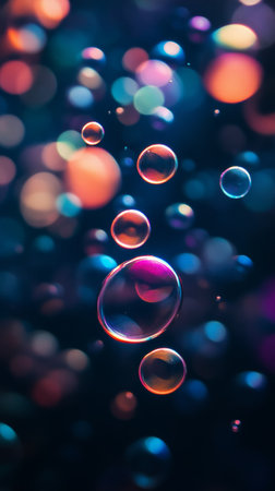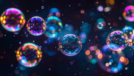 colorful soap bubbles with bokeh effect on dark background