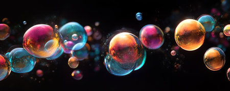Colorful soap bubbles on a black background, vibrant reflections. Abstract art and science concept
