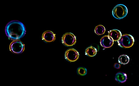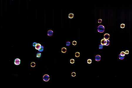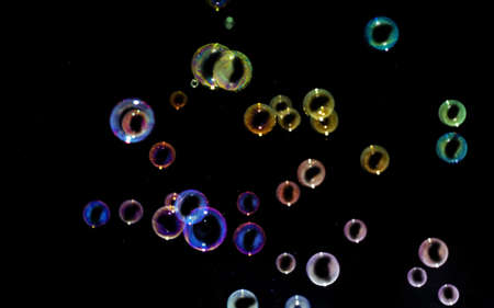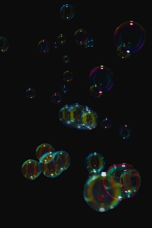 soap bubbles colorful float on dark background