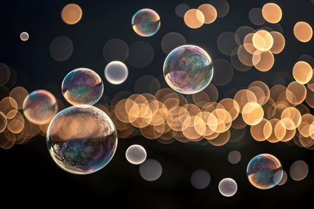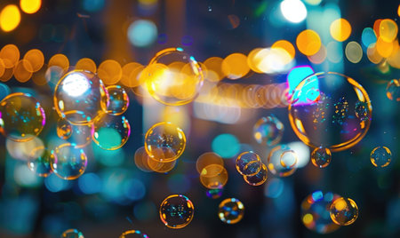 Soap bubbles sparkling under city lights, abstract background