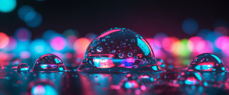 AI Generated. Iridescent Soap Bubbles Floating on Water with Blurry Lights