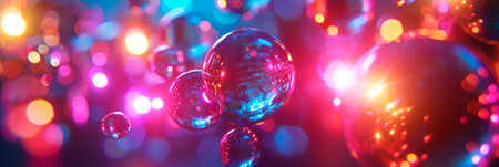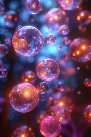 Elegant floating glass spheres reflecting multicolored lights generative ai