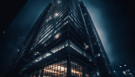Generative AI : Closeup on an office building in the evening with some lightened workspaces against dart night sky Modern glazed skyscraper Financial district Late hours in the off