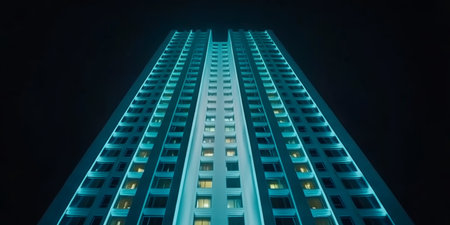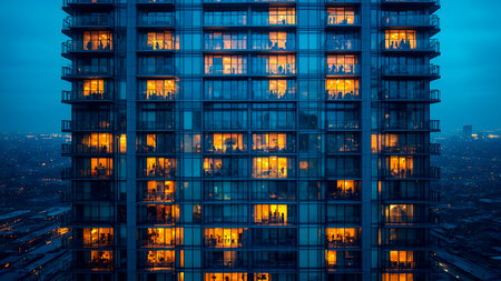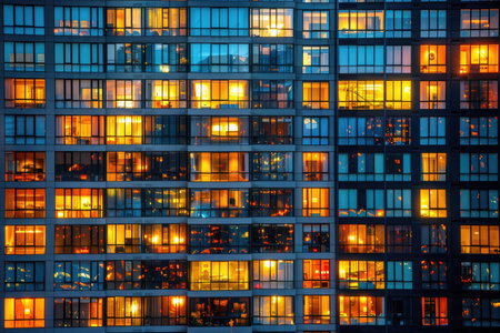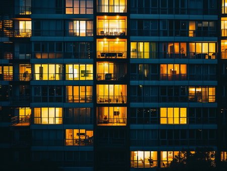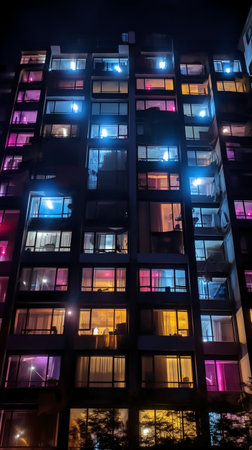 A stunning view of an apartment building at night, featuring numerous illuminated windows that create a warm, inviting ambiance within the urban landscape.
