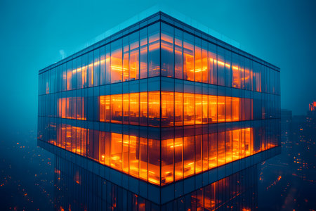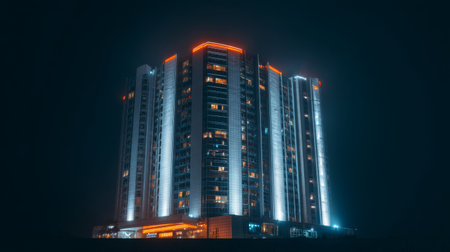 Modern office building illuminated at night, showcasing contemporary architecture and technology