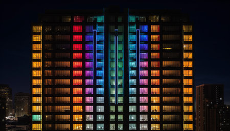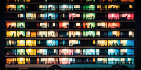 Bright colorful windows pattern at night. Front view facade of residential building with glowing lights in windows and balcony in the dark. Created with Generative AI