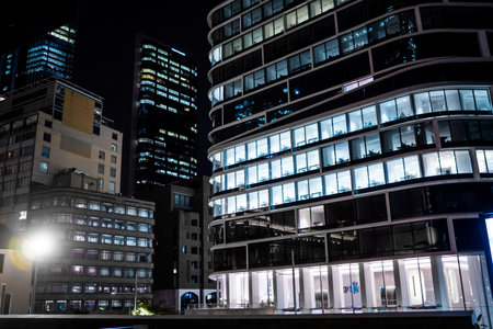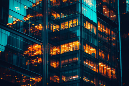 The image showcases an office building's exterior at night, with numerous illuminated windows. The composition highlights geometric patterns and sharp lines. Cool blue tones dominate, contrasted by warm yellow light. Suitable for commercial applications, the image represents business environments and architectural themes.