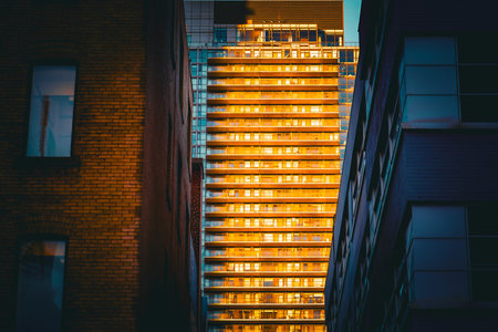 Urban Living, Modern Architecture at Night, Residential Building, City Lights, Windows