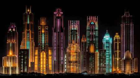 Glowing skyscrapers illuminate the modern city skyline generated by artificial intelligence