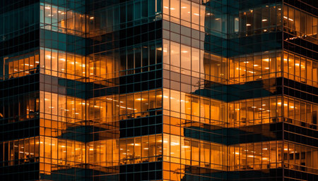 Vibrant skyscraper cityscape glows with modern lighting equipment at dusk generated by artificial intelligence