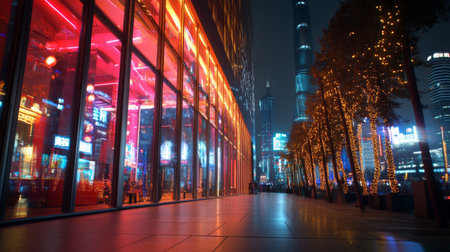 Neon-lit storefront featuring vivid pink and blue lights, creating a futuristic ambiance. Reflections on wet pavement enhance the urban night scene's vibrancy.