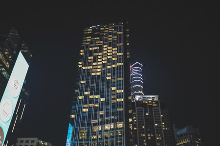 A captivating night view of skyscrapers, their windows glowing, creating a vibrant urban atmosphere.